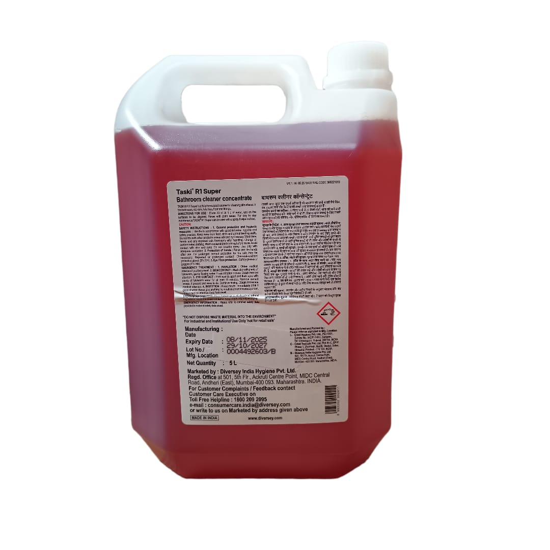 Diversey Taski R1 Super 5 liters is a fully formulated bathroom cleaner-cum-sanitiser designed for cleaning and sanitising all bathroom surfaces including sinks, tubs, tiles, floors, and fittings.