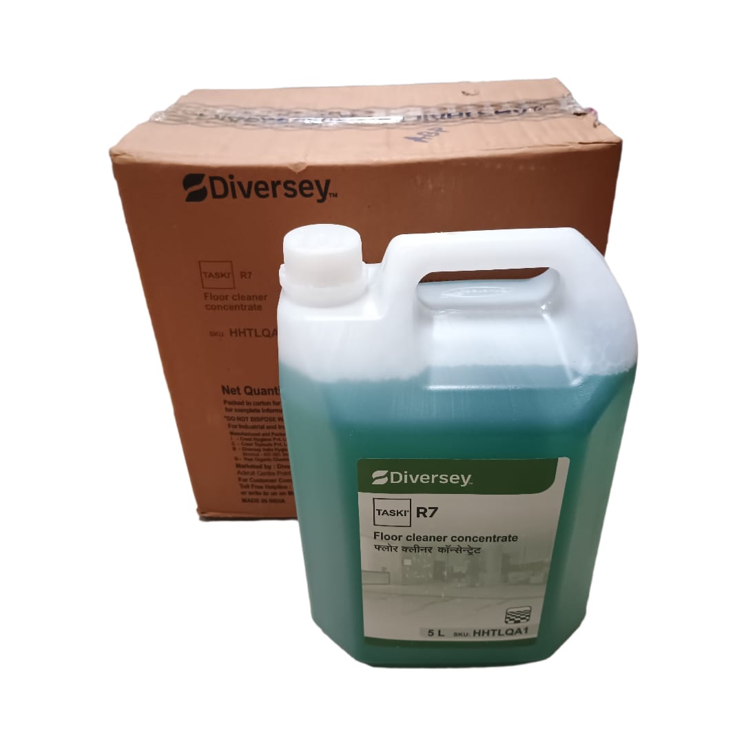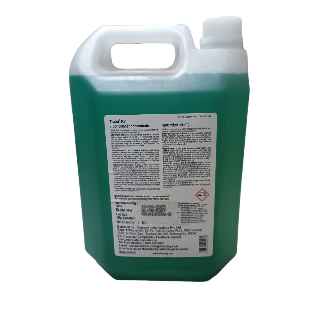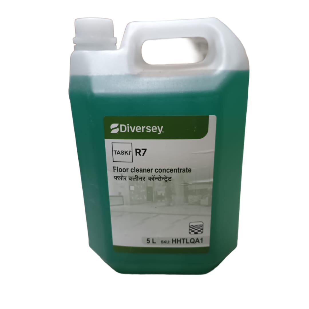 TASKI R7 is an effective floor cleaner. It can be used for both wet mopping as well as scrubbing with a machine. Concentrated for economy of use. When used as recommended (for normal soiling), TASKI R7 will cost less than Rs.
