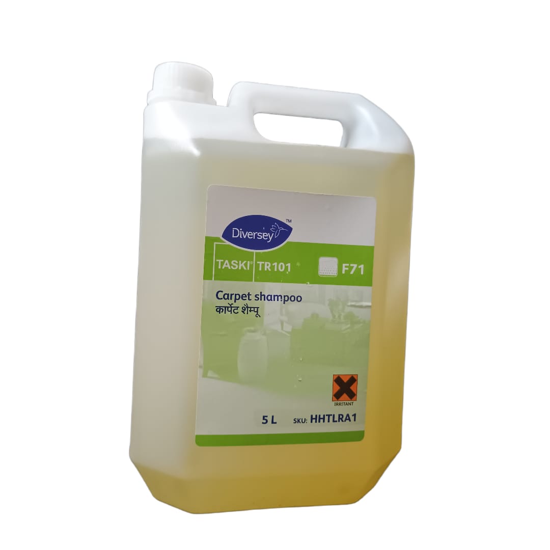 Taski TR101 is a pH neutral, pleasantly scented, concentrated carpet shampoo for the interim cleaning of all types of carpet and upholstery. The consistent, dry foam cleans gently yet effectively. Shampoo residue is easily removed by vacuuming, thus hindering rapid resoiling.