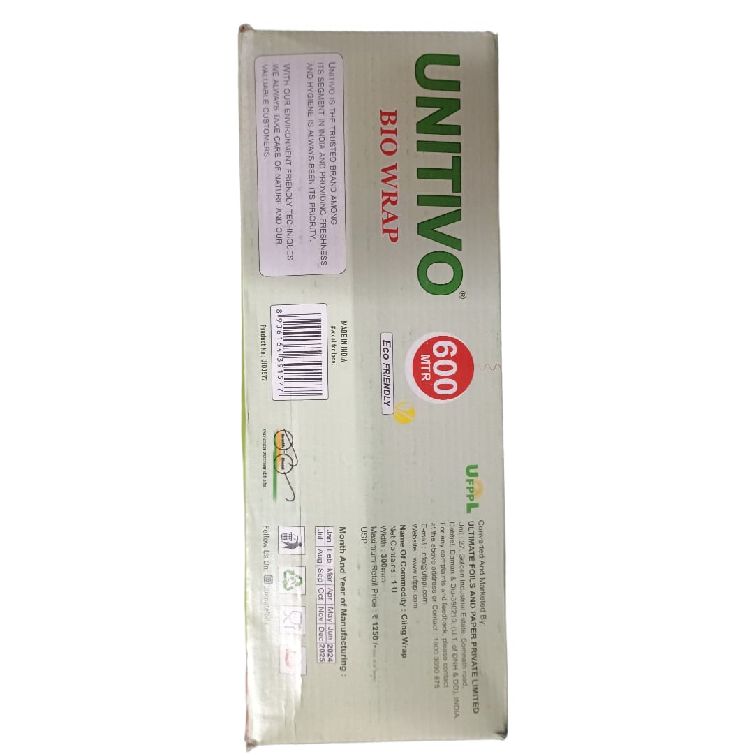 Unitivo Cling Film Wrap 600 SPL is a high-quality, food-grade cling film designed to keep food fresh, hygienic, and protected. It offers excellent cling and stretchability, sealing food tightly to lock in freshness and prevent contamination. Ideal for wrapping fruits, vegetables, cooked food, and containers, this cling film is suitable for both household and commercial kitchen use.