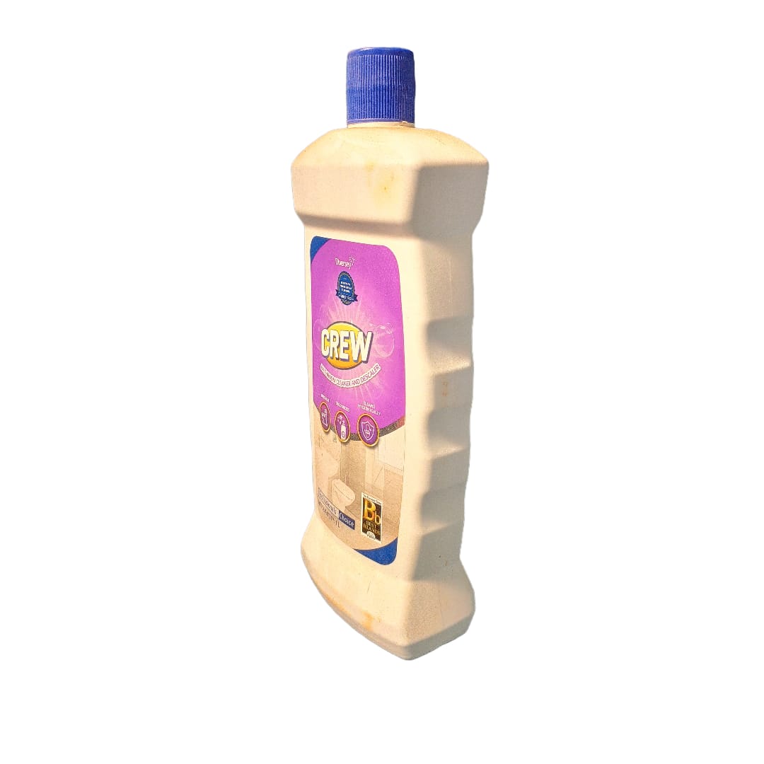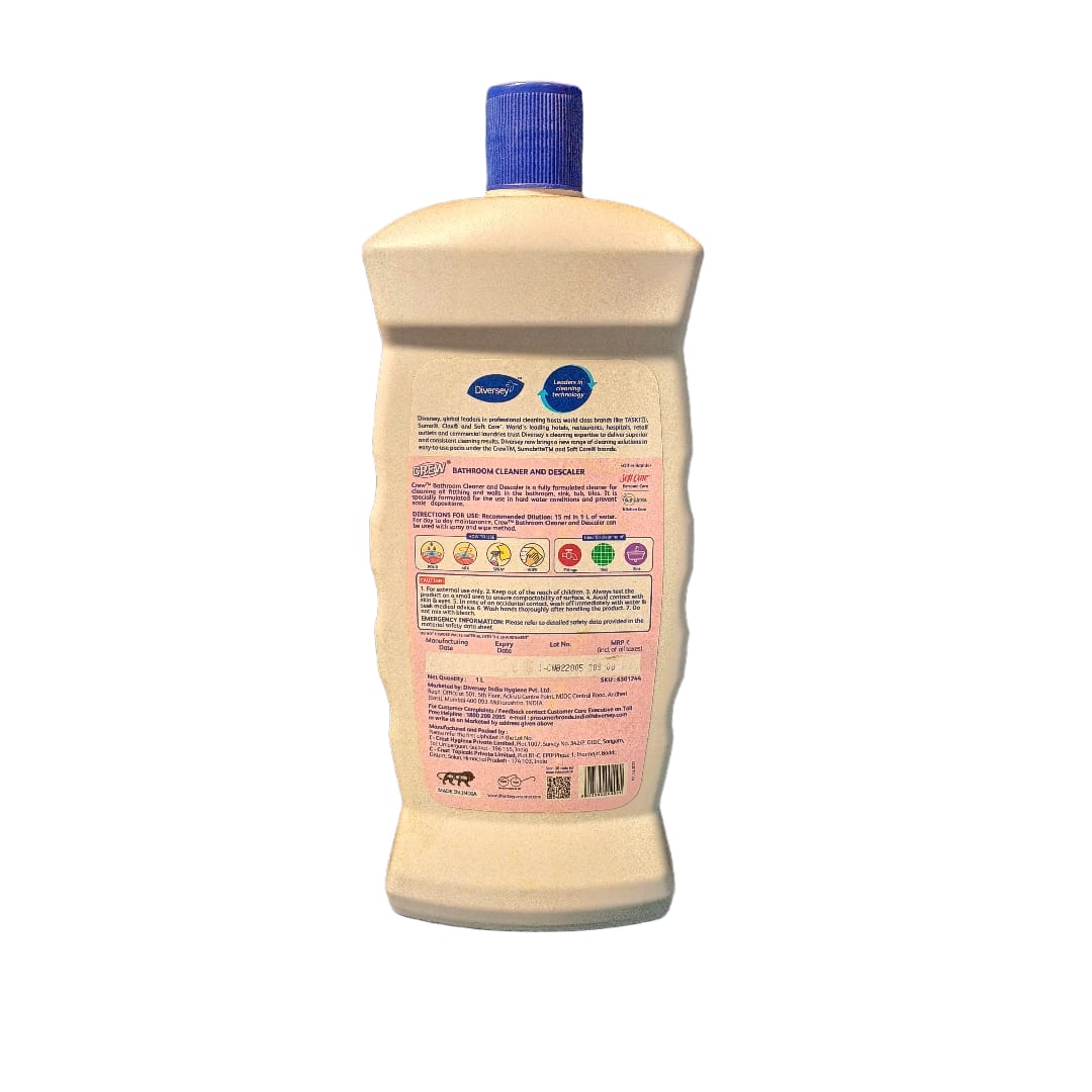 Crew Bathroom Cleaner & Descaler is a concentrated, mildly acidic liquid designed for hard water, effectively removing soap scum, dirt, oil, and hard water stains from bathroom surfaces like tiles, sinks, tubs, and fittings without abrasion, leaving them hygienic, sparkling clean, and deodorized with a fresh scent, preventing future scale buildup