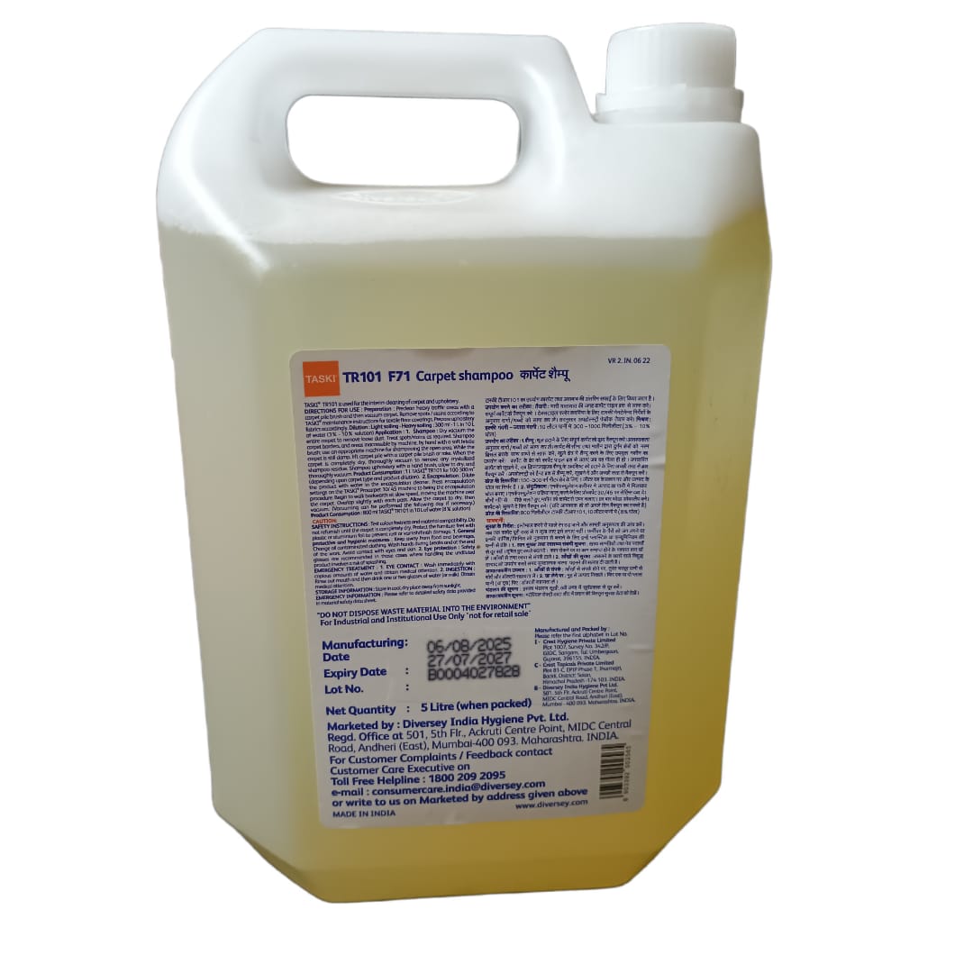 Taski TR101 is a pH neutral, pleasantly scented, concentrated carpet shampoo for the interim cleaning of all types of carpet and upholstery. The consistent, dry foam cleans gently yet effectively. Shampoo residue is easily removed by vacuuming, thus hindering rapid resoiling.